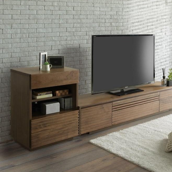 河口家具除了製作餐櫃之外,也推出了不少電視櫃。這次介紹的 ENN TV Board,以日和式條子設計,簡約整齊,左右兩旁是特大的儲物抽屜。櫃門部份以實木木條製作,隱藏的玻璃可讓紅外線穿透,美觀之餘不失實用性。