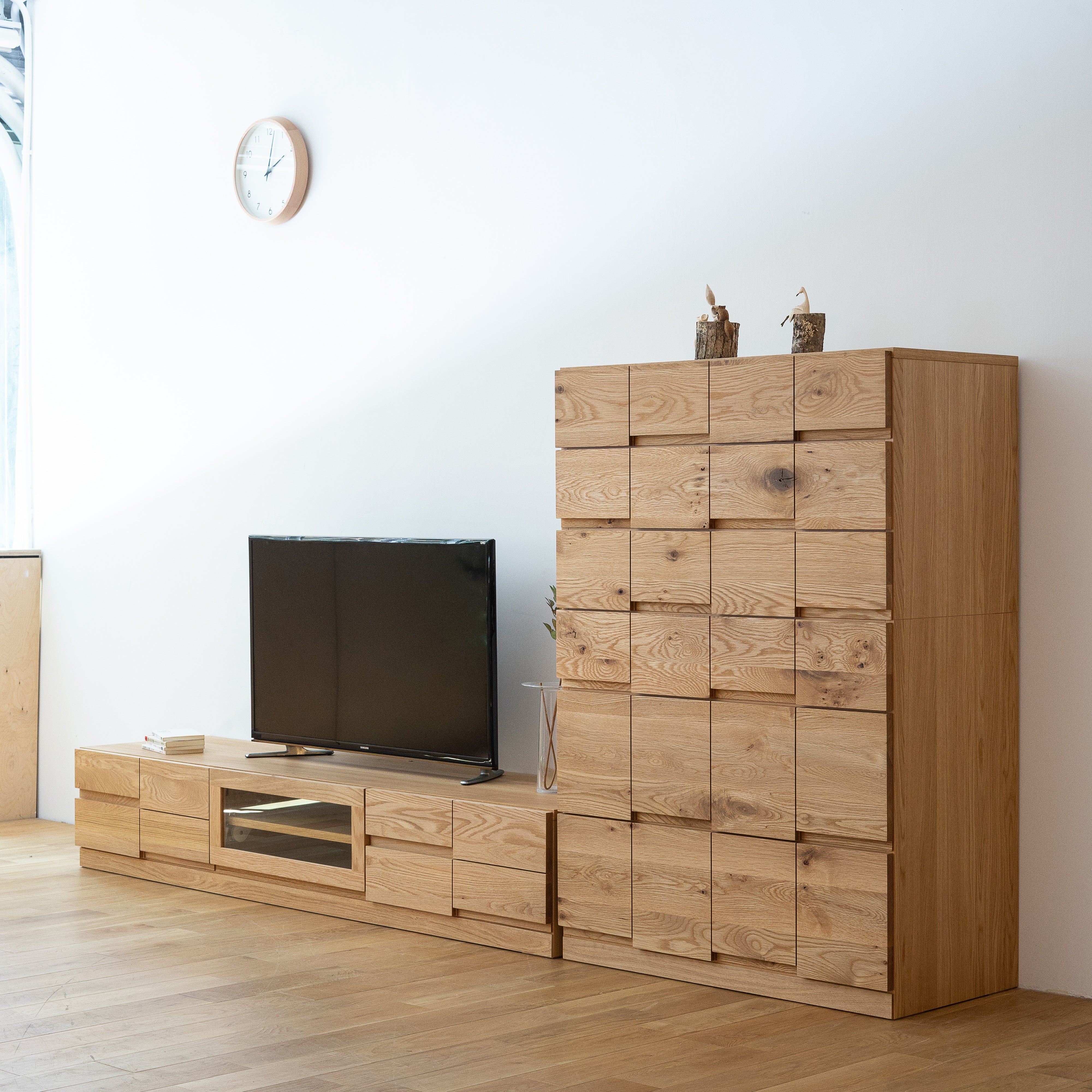 除了人氣高企的 Vita TV board 和 波浪木紋設計的Ride TV board,丸田木工帶來全新的坐地款式 Block TV board!坐地款式的 Block TV board 電視櫃,特別適合使用大電視的客人,電視機不論掛於牆或放在櫃上,比例都恰到好處,不會造成頭重尾輕的狀況。