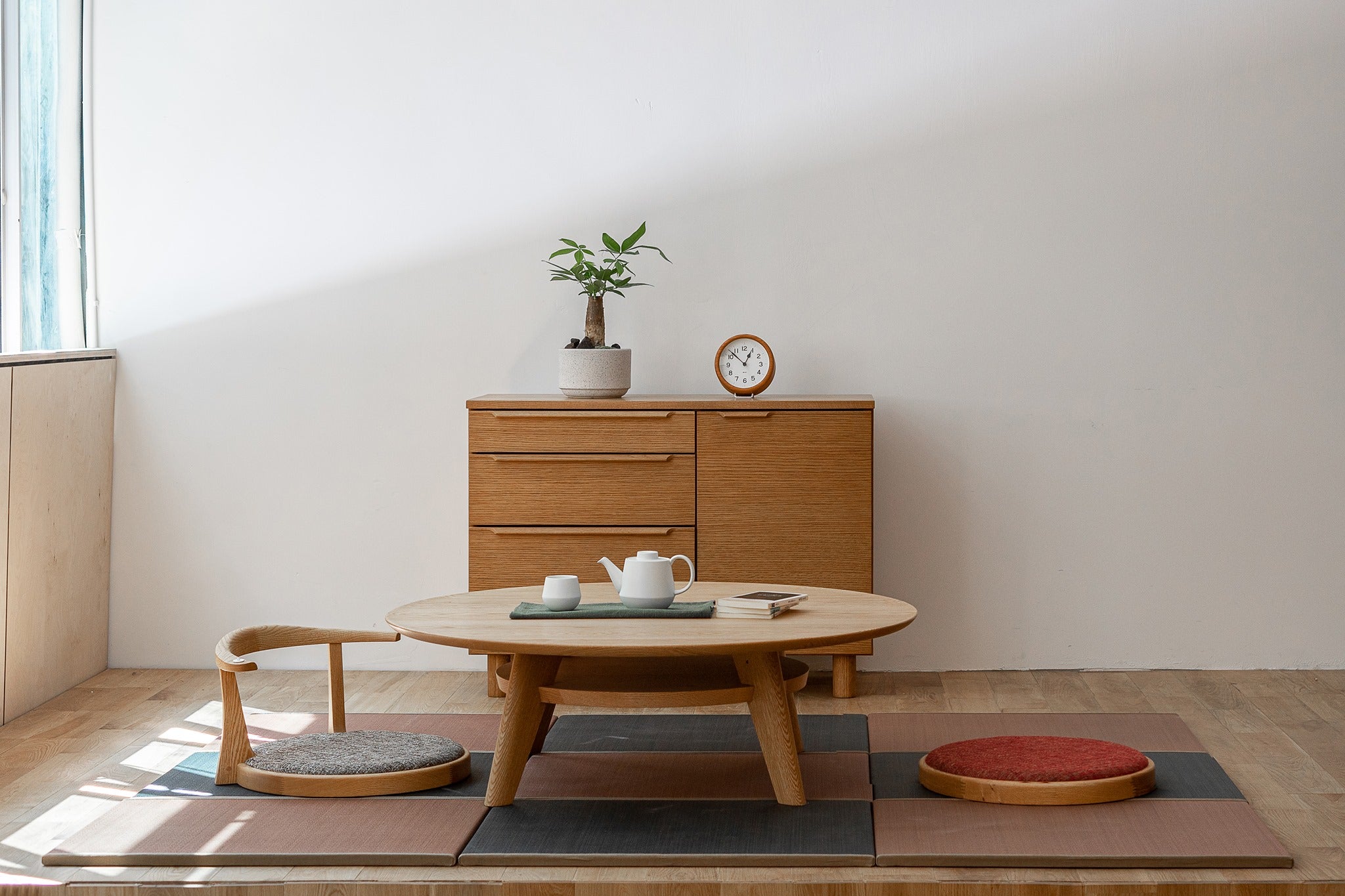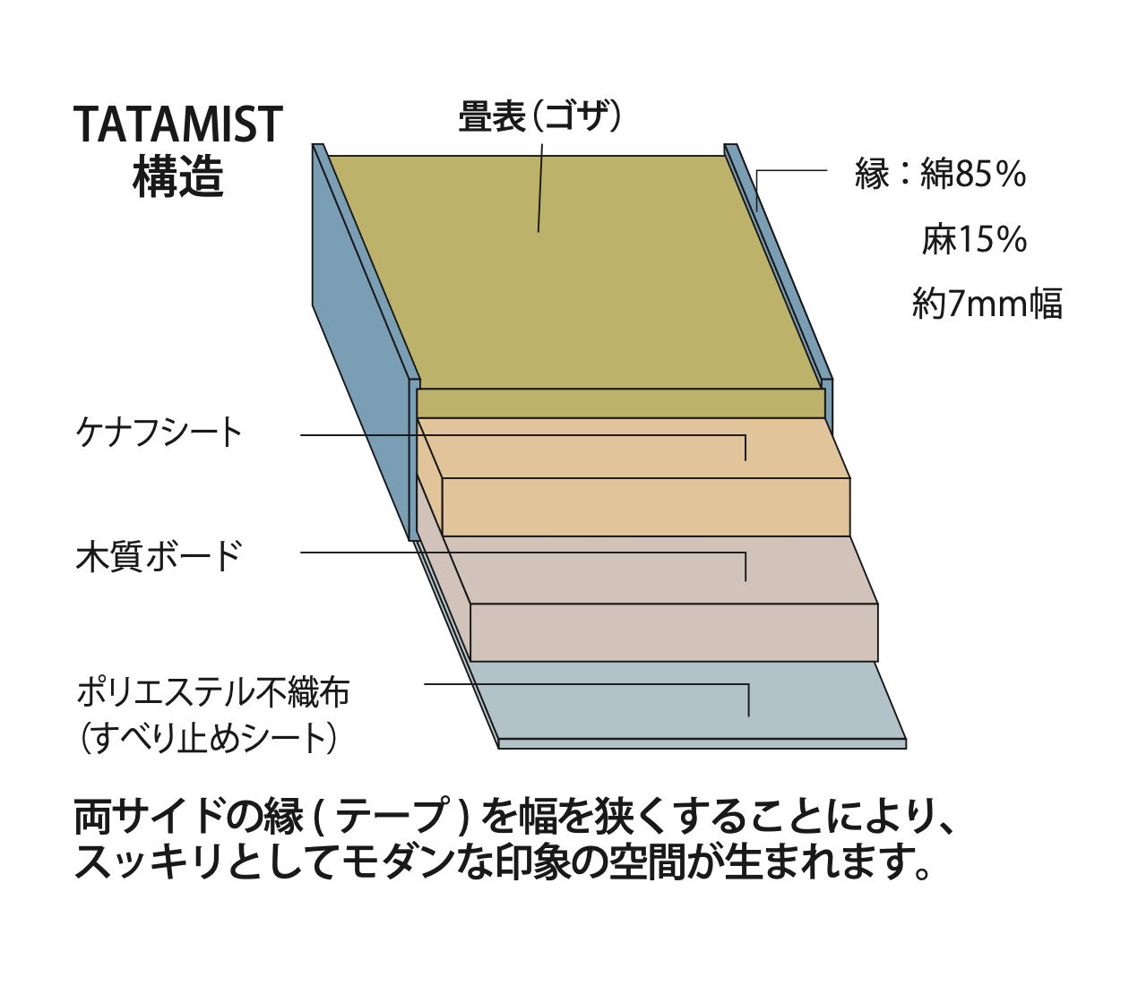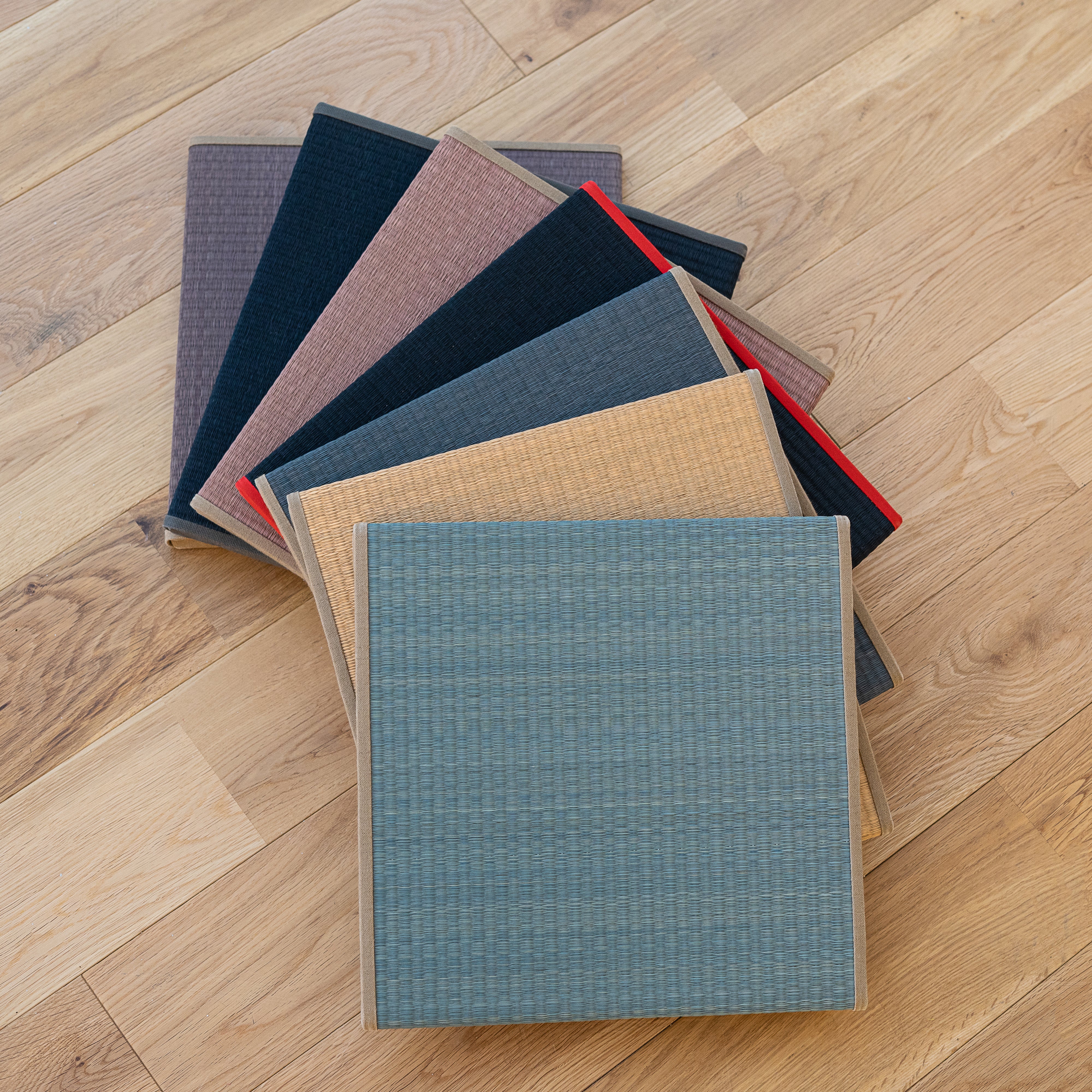 TATAMIST 與普通的tatami 大不同,它採用100%日本產的燈心草,以”目積織”的傳統精細織法,讓織紋更緊密幼細,不容易刮破和積塵。底部是防滑的不織布,旁邊則裹上用綿製成的厚布,耐磨又耐看。此外,TATAMIST 使用“白秋染め”方法來染色,所需時間比傳統工序來得長,但不容易因日曬而色落,十分耐用。