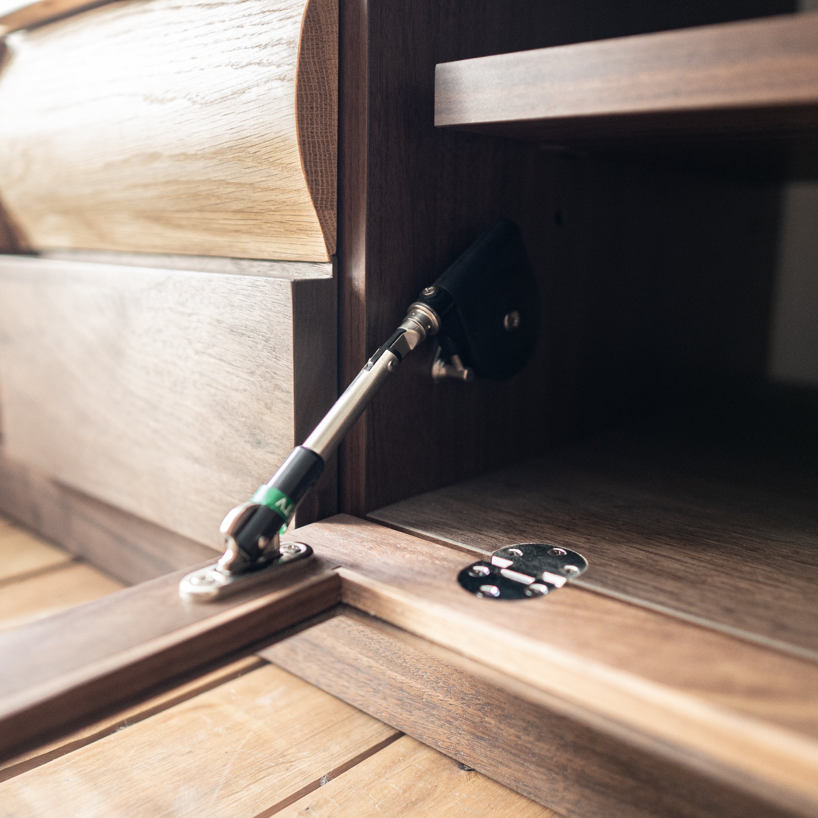 然而,Popolo TV Board不僅只有外表好看,在用料方面,內籠以日本桐木所製,吸濕防潮又防蟲;而中間的玻璃門則採用撳彈緩衝技術,比一般的金屬門鉸更耐用。